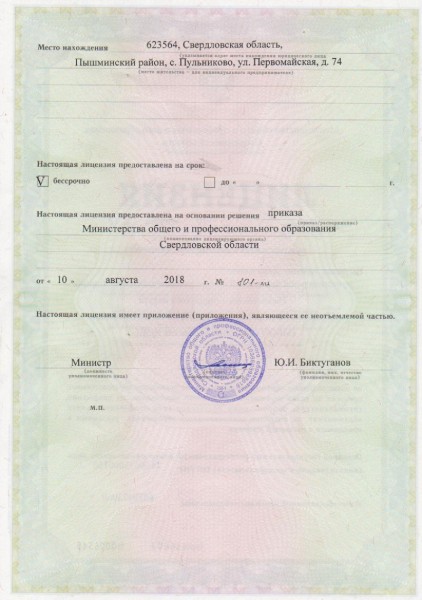 - Места осуществления образовательной деятельности при использовании сетевой формы реализации образовательных программ: Россия, 623564, Свердловская область, Пышминский район, с. Пульниково, улица Первомайская, 74.